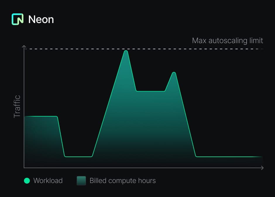 Neon solves this inefficiency via a serverless architecture. By natively separating storage and compute, Neon implements two features that allows you to pay only for the compute you use without investing any manual work: autoscaling and scale to zero.